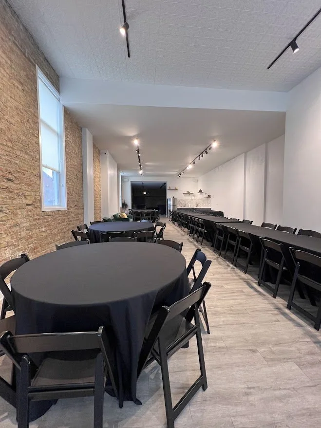 Spacious event venue with wooden floors, exposed brick walls, and track lighting. Round tables with dark blue tablecloths and black chairs are arranged in the room. Large windows provide natural light from the street view outside.